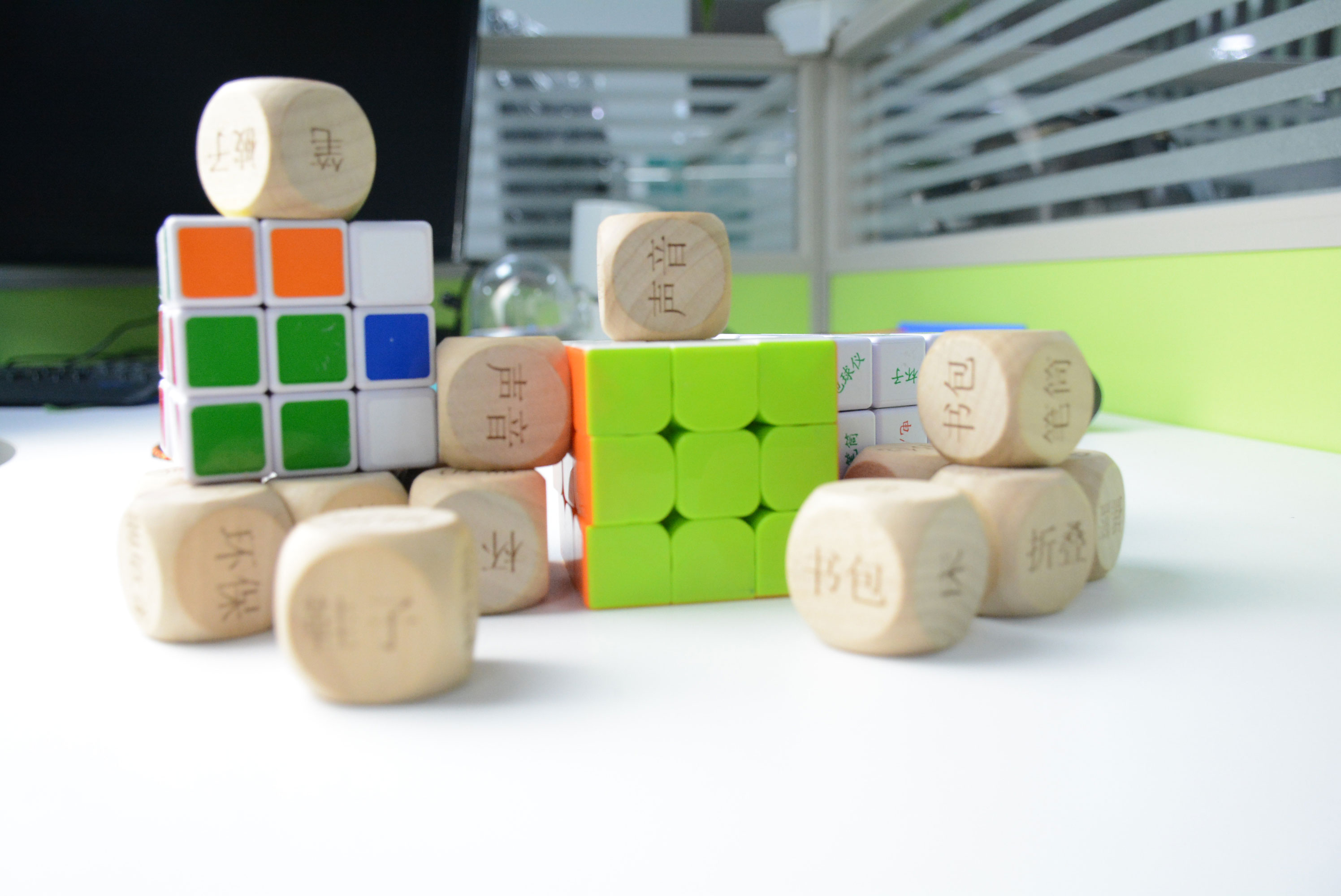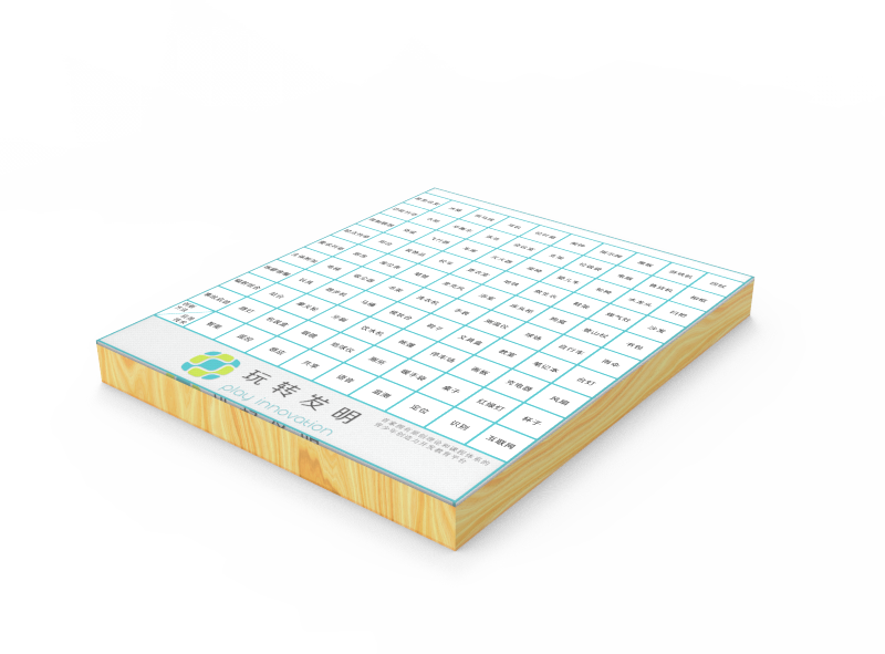 骰子一共有12個,配以彩色文字,一共有四種顏色。紅色文字的骰子有1個,藍色文字的骰子有2個,黃色文字的骰子有3個,黑色文字的骰子有6個。孩子可在多個骰子里任選一個或多個,隨意往桌上扔,在骰子文字提示下,產生聯想,并說出發明創意。