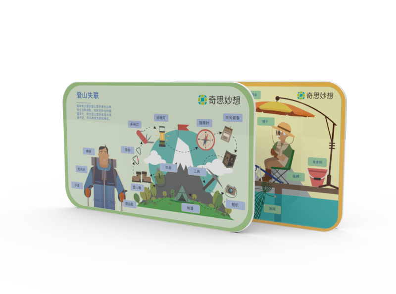 包含飛鏢盤1個,飛鏢多個,卡片42張。孩子可將飛鏢對準飛鏢盤進行投擲,飛鏢落在發散思維或創意挑戰的選項上,需要根據相應卡片答題,并根據卡片說出發明創意。
