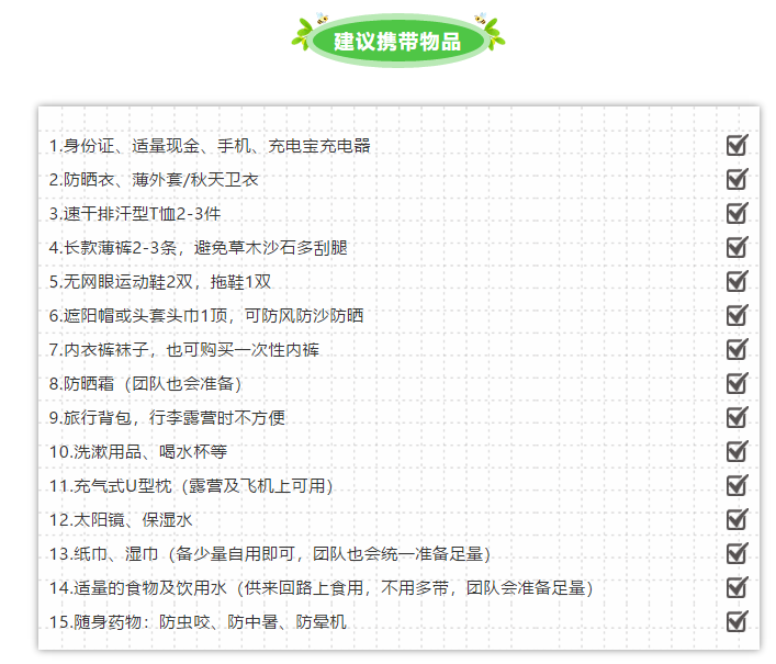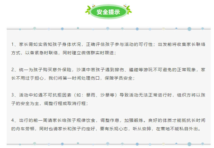 后勤保障:專業的安全員,營地基本醫療保障,食宿保障。