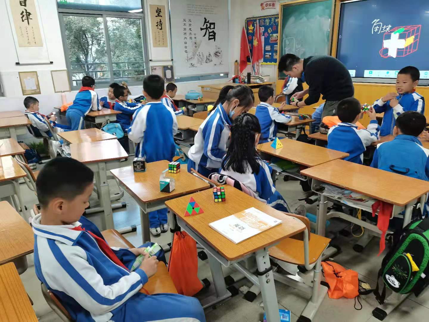 對于不太熟悉怎樣轉動和復原魔方的同學,他們還會互相幫助,在交流討論中一起動手,共同學習和掌握魔方的玩法。