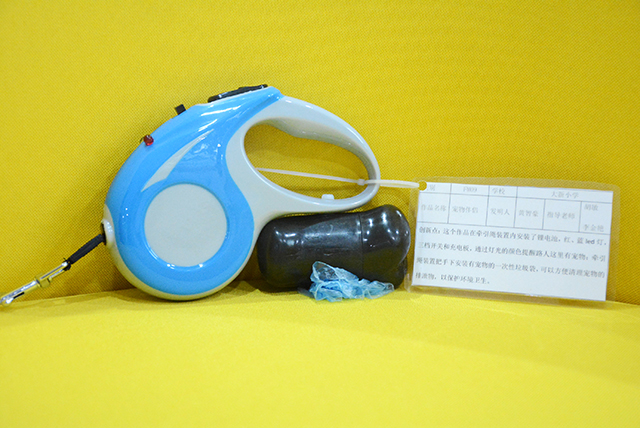 這個(gè)作品是一個(gè)寵物伴侶,作用是提高在外遛寵物時(shí)的安全性,便利性。這個(gè)作品在牽引繩裝置內(nèi)安裝了鋰電池,紅、藍(lán)led燈,三檔開(kāi)關(guān)和充電板,可以通過(guò)三檔開(kāi)關(guān)控制紅、藍(lán)燈的亮滅,通過(guò)燈光的顏色提醒路人這里有寵物;牽引繩裝置把手下安裝有寵物的一次性垃圾袋,可以方便清理寵物的排泄物,以保護(hù)環(huán)境衛(wèi)生。