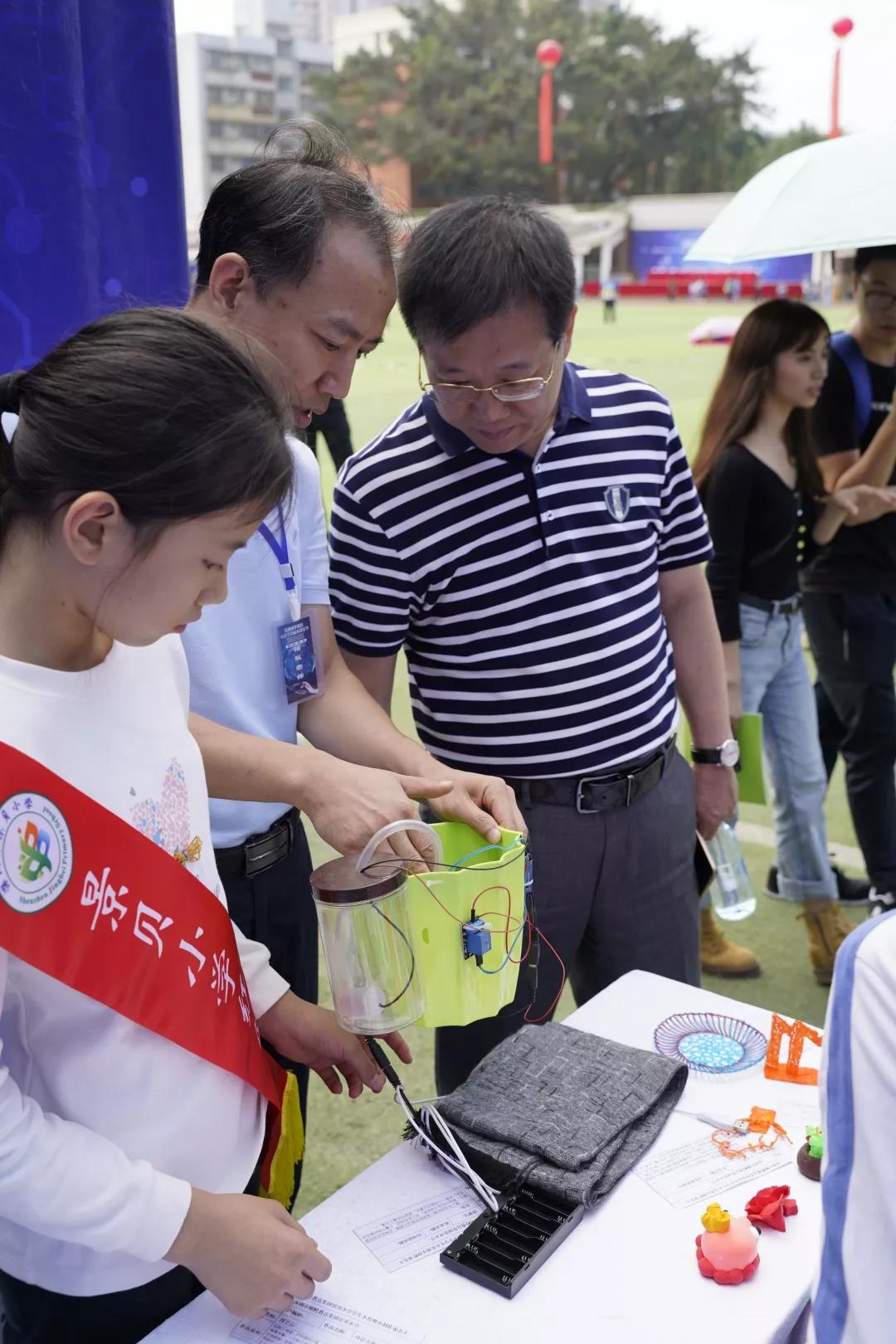 △羅湖小學以“學雷鋒、好習慣、大創客、創未來”為校園四大特色文化,積極開展創客實踐,本次創客節活動展示了《雨衣頭盔》《磁感線應桌子》《帶卷筆刀的桌面吸塵器》《按摩花灑》等多項學生小發明。